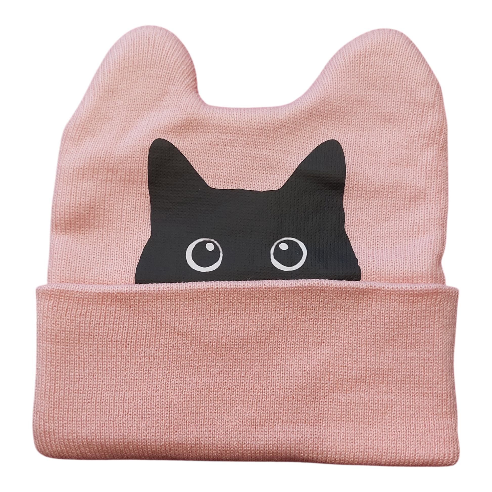 Vaaleanpunainen kissapipo kääntöreunalla.